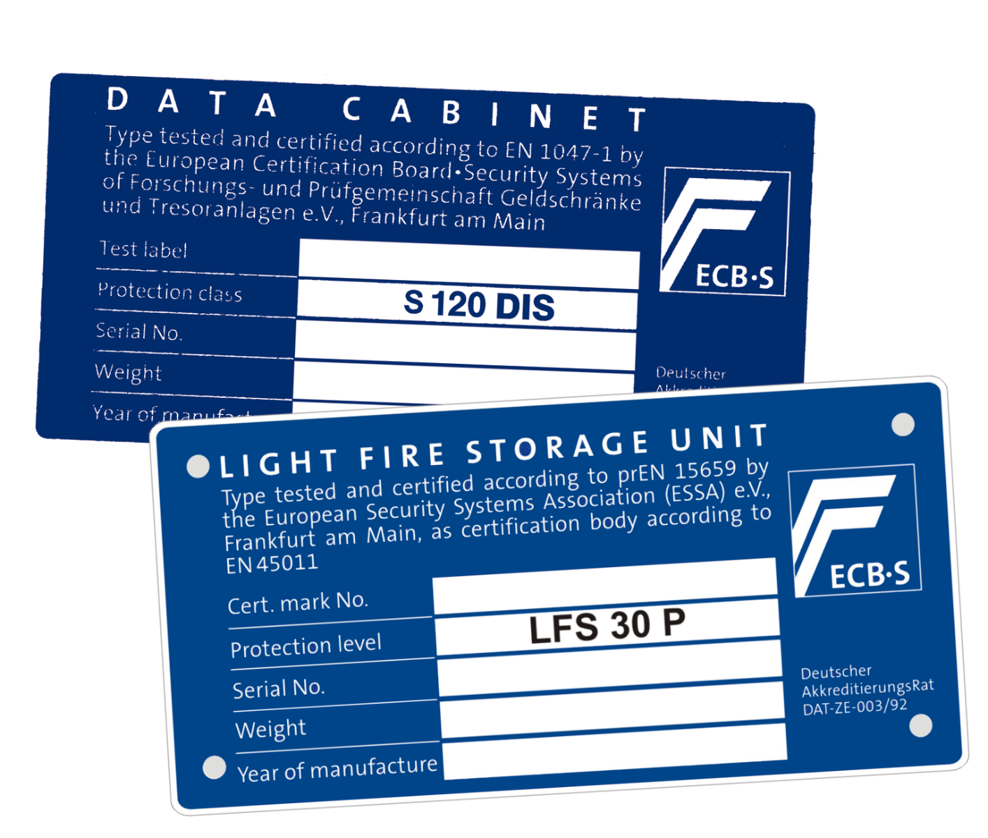 Das ECB-S-Gütesiegel steht für die Qualitätssicherung bei Sicherheitsprodukten wie Tresoren, Schliessfächern, Datensicherungsschränken und Tresorschlössern. Erkennbar ist diese Qualitätsgarantie anhand der Gütezeichen, welches als gut sichtbare Metallplatte an jedem zertifizierten Tresor angebracht ist. Bei Tresoren und Geldkassetten befindet sich diese Metallplatte oft auf der Innenseite der Tür.