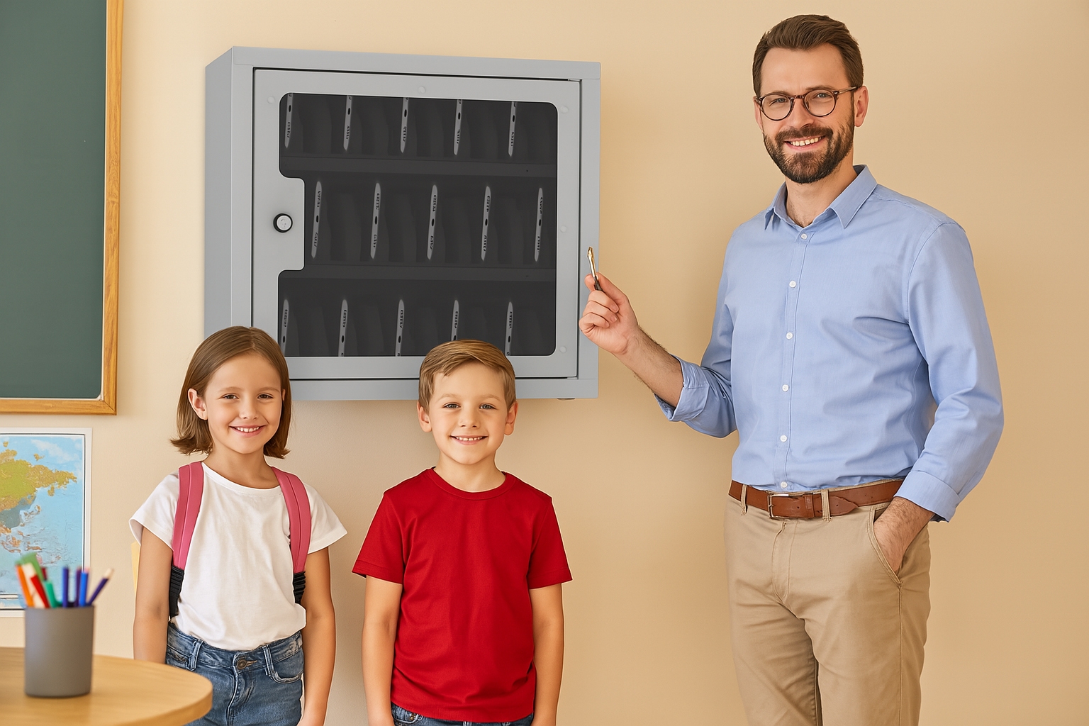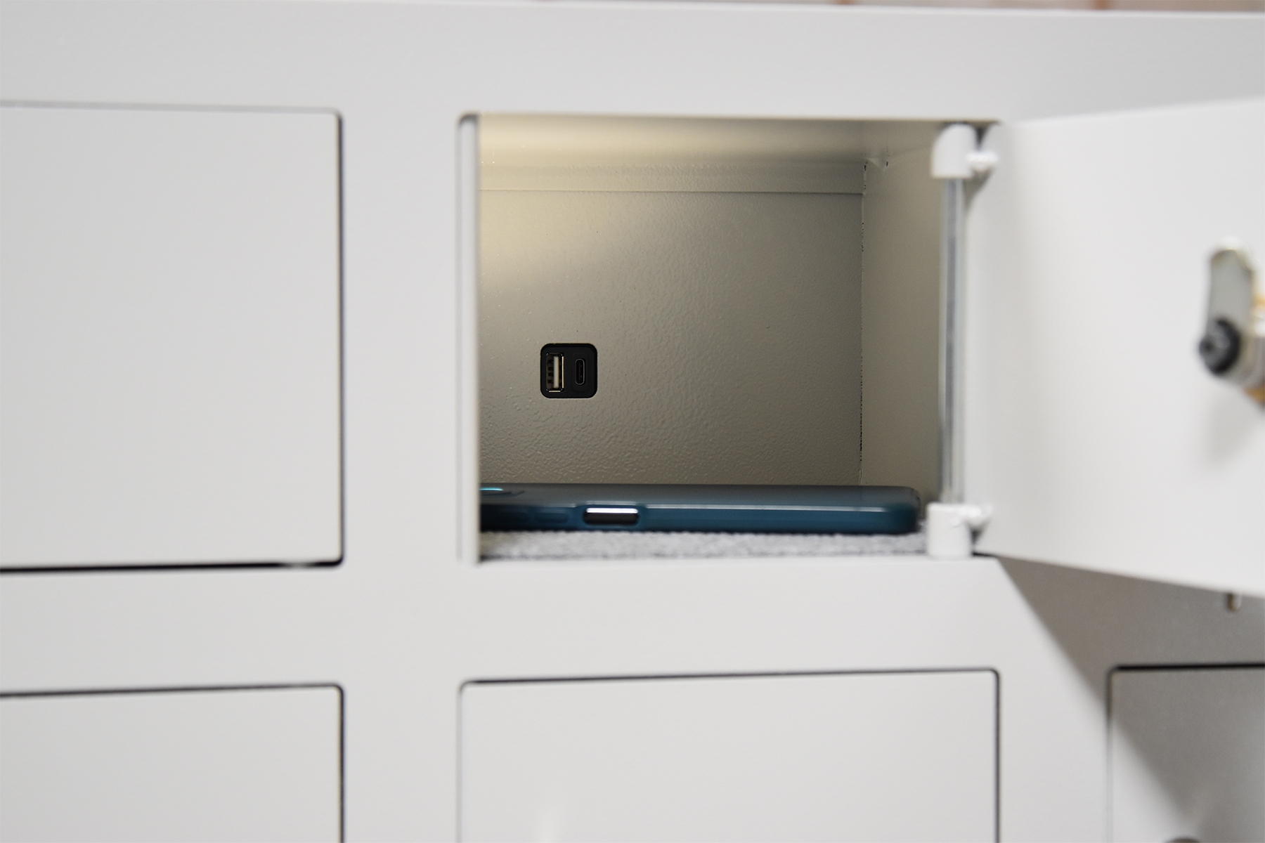 Für Schulen, die eine zentrale Sammelstelle für Mobilgeräte bevorzugen, ist der ORGAMI Handyaufbewahrungsschrank HS eine platzsparende und sichere Alternative. Er eignet sich zur sicheren Aufbewahrung von bis zu 30 Handys. Ob im Klassenzimmer, Lehrerzimmer oder Flur – dieser Schrank bietet eine sichere, platzsparende Möglichkeit zur Aufbewahrung und überzeugt durch durchdachte Ausstattung mit:
