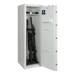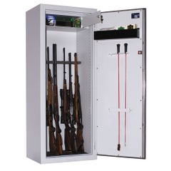 Der Waffentresor ist in mehreren Versionen erhältlich, wobei die größte Version nicht weniger als 14 Waffenhalter besitzt. Sie können wählen, ob Sie den Tresor mit einem Schlüsselschloss oder Elektronikschloss ausstatten wollen. Der Tresor hat auch ein separates abschließbares Innenfach, in dem Sie Ihre Munition getrennt von Ihren Waffen aufbewahren können.