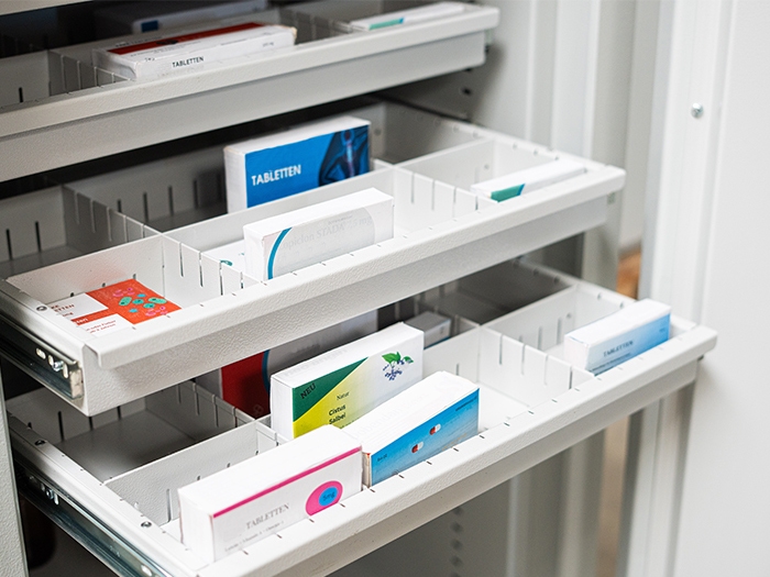 Für jede Tresorgröße stehen zwei Standardmodelle zur Auswahl, die sich vor allem in der Anzahl der Schubladen und Fachböden unterscheiden. Zudem können sowohl die Anzahl als auch die Anordnung der Fächer nach Ihren individuellen Wünschen gestaltet werden. Diese können so wie auf den Bildern oder aber auch individuell eingesetzt werden. So können Sie Ihre Medikamente, Betäubungsmittel und weiteres nach Ihren Bedürfnissen aufbewahren.
